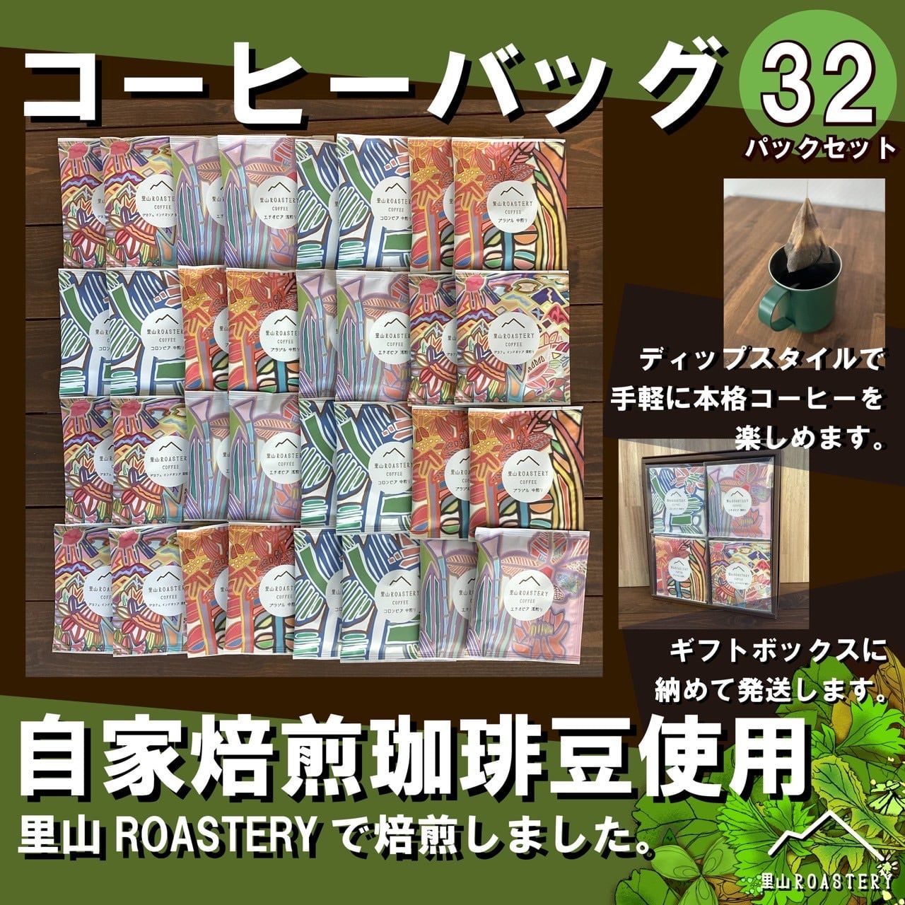 里山のディップスタイル コーヒーバッグ 32PギフトBOX(8Pセット(エチオピア・ブラジル・コロンビア・インドネシア(カフェインレス)×各2P入り 4個入り)